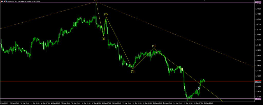 下記は、GBP/USDの1時間チャートです。GBP/USDの1時間足では、日足の内部波動を確認していました。内部波動の5波を狙っていましたが、乗り遅れてしまいました。しかし、下降余地は十分ありましたのでエントリーを狙っています。