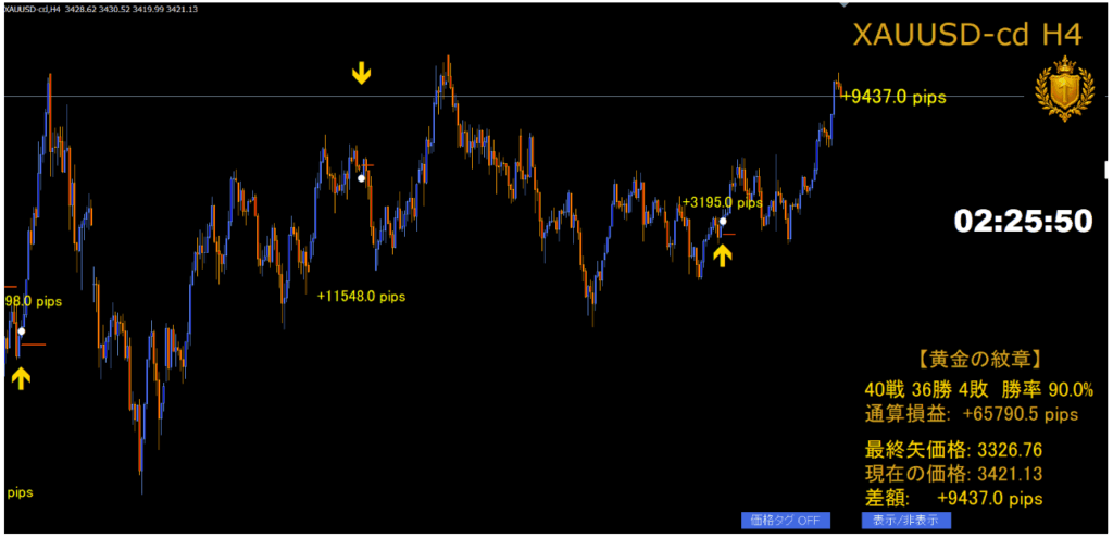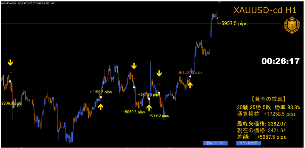 • 画面右に、チャート上の全矢印による取引の勝率と損益が累計表示される