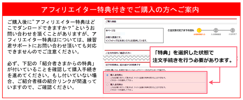 特典付きでご購入する場合は、下記のように「紹介者さまからの特典」がついていることを確認して購入手続きを進めてください。
